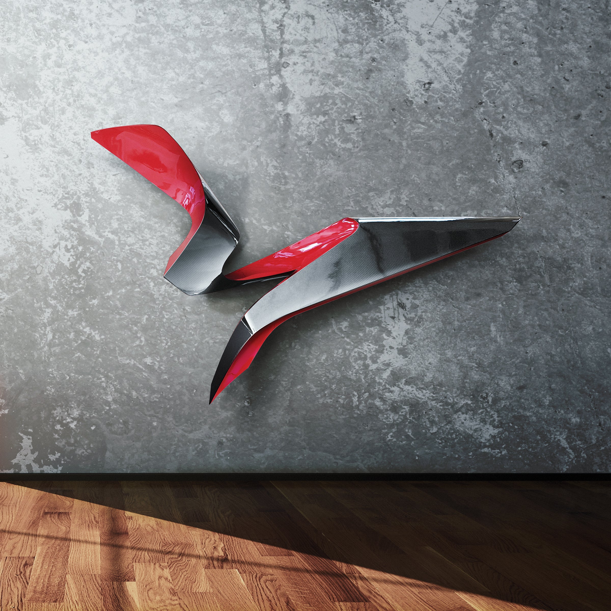A three-dimensional carbon-fiber statement piece - 300×200x50 cm of pure attitude. Light as a whisper, sharp as a supercar panel, and bold enough to bend the room around it. It catches reflections, steals attention, and basically refuses to behave like a normal sculpture. A dream carved from carbon, built to float, twist, and mess with your sense of space.